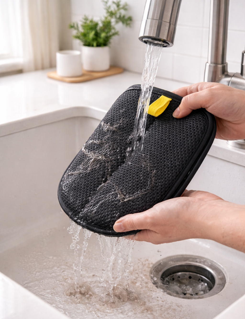 Contrairement aux rouleaux adhésifs jetables (5-10€/mois), vous rincez le gant sous l'eau et c'est reparti. Zéro déchet, économie garantie.